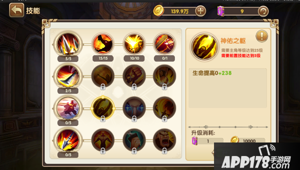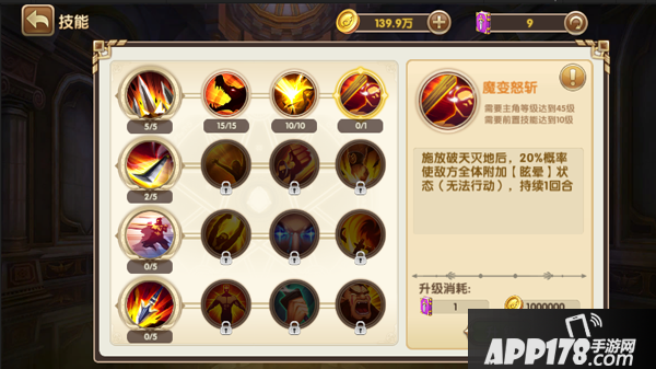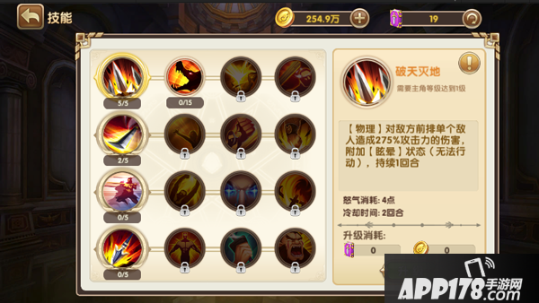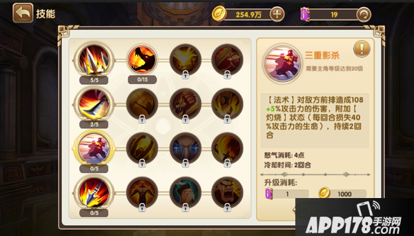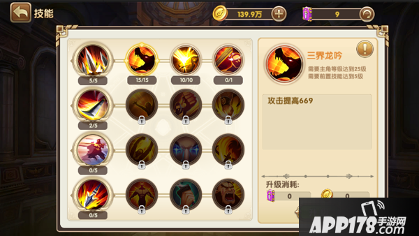 接着来说升级技能要看的第二点,就是前置技能所开启的技能线。在幻世战仙的技能系统里,每一行都是一条独立的技能线,只有开启的前置技能才能升级后面的技能。