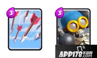 我的一选是箭雨+炸弹兵,其实这个上面的选择很多,换成法师可以对空,箭雨就能换电击,或者换成龙宝宝,但是法师相对太不灵活,容易被卡费,多余的2费完全是为了防空,除非遇上纯空军阵容,否则相对炸弹人优势不明朗;龙宝宝是一张攻防卡,攻击低血量高,在防守卡内战时会相对有用,可以裸下滚动手牌,但是环境中还是进攻卡组多,相对还是炸弹人好。加上新来的攻防卡,足以应付大多数对局。