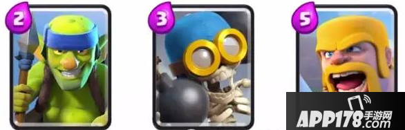 在防御类的卡牌推荐中,骷髅墓碑作为可以克制高爆发卡牌和肉盾卡牌都有不错的效果,所以是一张必不可少的核心卡牌;对于人海战术,投弹兵圣水消耗不高,可以在没有法师的时候替代法师,再配合万箭齐发可以克制血量低但已经聚堆的人海;对于建筑流,如果带火箭,圣水消耗比较高,可以考虑用4圣水的火球替代,同时火球可以在万箭齐发CD的时候用于替代,性价比高,也是推荐卡牌中的核心卡牌;最后对于进攻消耗类卡牌,哥布林投矛手和弓箭手可以2选1,而野蛮人在消耗战中,可攻可守,是一个多单位的半肉半输出,是一张必选卡牌,于是,我们可以确定好以下6张卡牌。