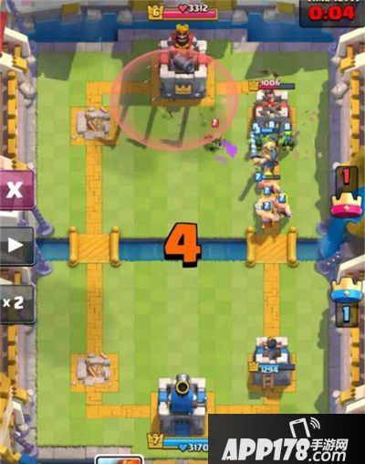 接下来第四个桶,我选择右护卫塔,让哥布林分在塔的三个方向的标准丢法,这个时候对方手上没有万箭齐发,选择用部队卡牌速清,塔又掉了约500血。