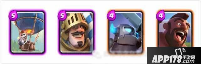 巨人(5费)、投弹兵(3费)、火球(4费)、小皮卡(4费)、哥布林投矛手(2费)、飞龙宝宝(4费)、弓箭手(3费)、骑士(3费)