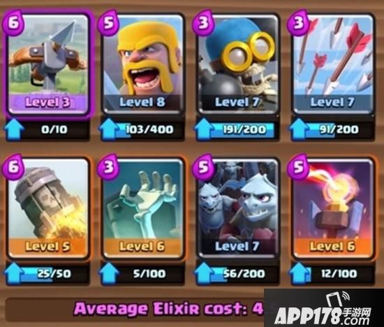 这套卡组的平均配置是“246”,如果是一直在玩的小伙伴一周多基本可以将卡升级到这个水平,其中2级王子是看缘分的,如果没有的话也可以用木桶/冰冻来替换。