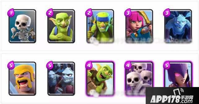 巨人(5费)、哥布林投矛手(2费)、小皮卡(4费)、女武神(4费)、王子(5费)、投弹兵(3费)、弓箭手(3费)、火球(4费)