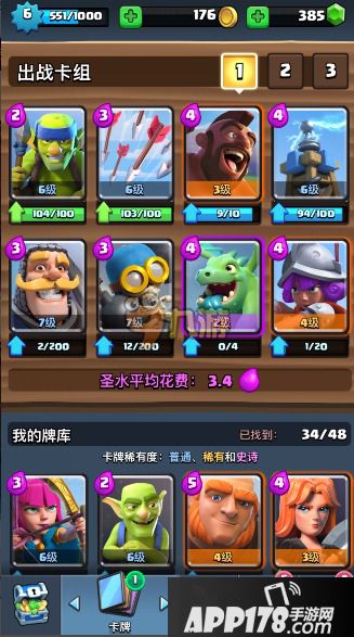 即1级紫卡=5,3级橙卡=5,上图就是APP178手游玉米蹭上6阶竞技场的一套卡组,按照计算方式就是(紫)6+(橙)6+(橙)5+7+7+6+6+6=49/8=6.125;所以这套卡组总等级就是49,除以8的结果是6.125,所以整数为6,也就是A6,玉米也刚好是蹭上了6阶竞技场。。