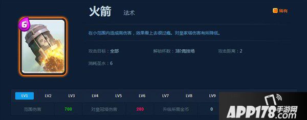 火箭类似雷电法术,它们都需要六点圣水,但火箭的伤害高得多。主要的区别在于火箭的半径小得多只有2,雷电法术则是3.5。因此火箭成为了对付建筑的最佳法术,尤其是炸弹塔+X弩这样恶心的combo。