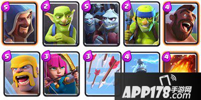 5)弓箭手:类似于长矛哥布林,弓箭手(简称MM)多了一费,但是伤害更高,血更厚。拿八级卡牌为例,mm是241点血,长矛只有100点,所以长矛会被箭雨,飞龙宝宝,法师,小闪电等等卡牌一击击杀,但mm可以在这些情况下保证生存。不过,高等级游戏中,mm会很快地被公主淘汰掉。