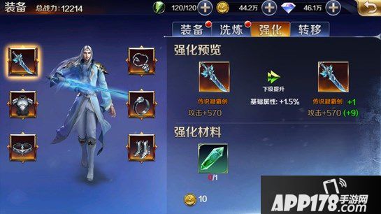 3、装备强化,可消耗强化材料和金币进行强化,强化越高,所加属性越多,战力提升也越高,若是钱多,可一键直接强化,省时省力
