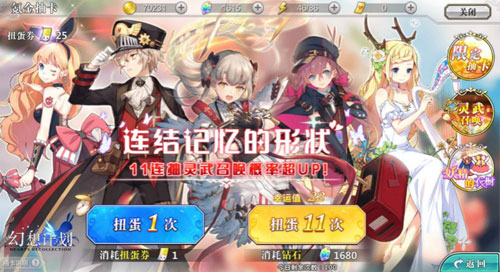 在《幻想计划》中,灵武的产出主要有三种方式。其一也是最简单的,通过积攒扭蛋券或钻石,通过首页的“氪金”按钮进入抽卡界面,扭蛋券每张可以抽取一次,钻石则是168钻可以抽取一次,但如果想抽取11次,则只需要1680钻,首次十连还有5折活动哟!