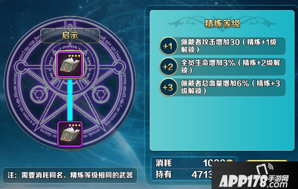 精炼:使用两把(一模一样)同名称同精炼等级同星级的武器可进行精炼,精炼后可解锁武器技能。