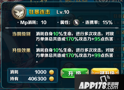 升级:消耗金币升级,也可一键快速升级,升级后技能效果得到提升。