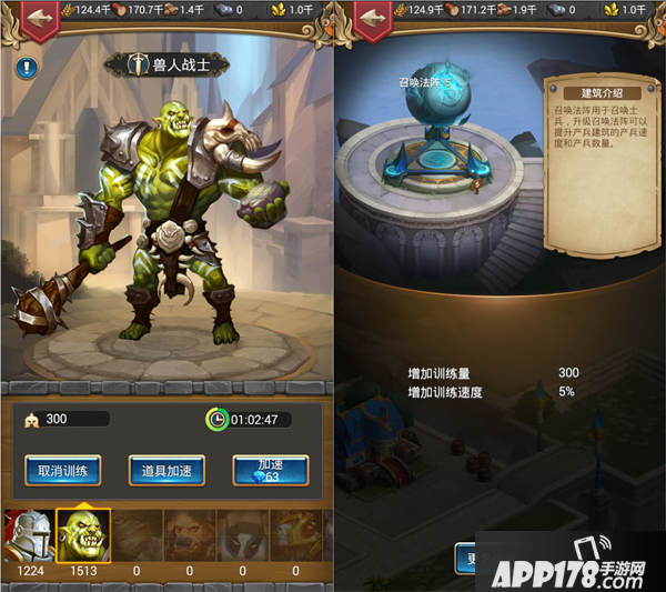 在游戏的初期,先不用训练过多士兵,够用就好。你要做的是利用前期任务奖励资源来升级相应的主城建筑,用于提升兵营等级来获得高级士兵的生产权。同时,利用召唤法阵的增加训练量加快士兵的产出,这样才能在各种战斗中占据更大的优势!