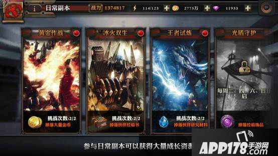 规则:玩家通关关卡2-10(即第二章)后可开启日常副本玩法。日常副本玩法共有5种不同副本,每种副本均有相应开启时间、等级和奖励;每个副本均有独特的玩法,并且有5档难度区别;不同难度在玩家的不同阶段开放;