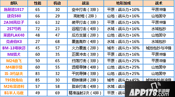M4谢尔曼:敌军越多,攻击力和战法威力越高B1半人马座:可以释放两次战法