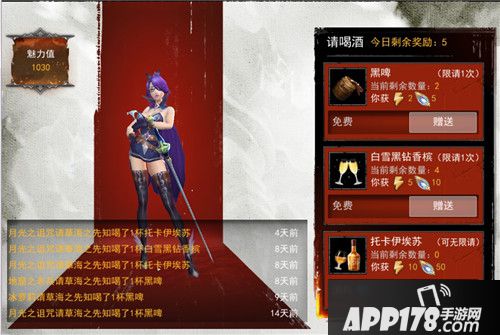 玩家每天都会自动获得5个黑啤,也有5次请别人喝酒的奖励次数。请不同的美酒,自己将获得不同的体力和魅力奖励。5次奖励次数用完后,继续请喝酒将不会获得体力奖励,但是还是可以获得魅力奖励。