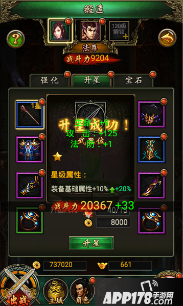 接下来就要来介绍下升星,升星是一个很重要的东西,大家都了解,一个好的装备是能使你的能力巨大的提升的,而这个升星就是直接的按照百分比来增加你装备的属性,也就是说,越到后期,这个提升的越多,升星的话就需要升星石,这些都是可以在日常的任务,竞技场或者是一些VIP的礼包里面获得的稀有的石头,虽然少,但是要尽量的多去想办法得到。