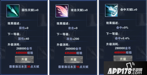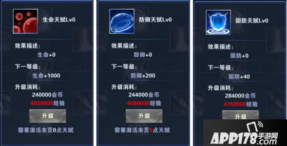 天赋树的升级需要大量的资源,除了生命天赋每升一级增加250点战力之外,其他天赋均是每级增加200战力,因此如果勇士们不是每项天赋都必须点满的土豪的话,专注于提升某几项天赋到高等级好过于每个都点那么一两级,这样加点的好处是带来的战斗力加成比较明显,而且性价比比较高。具体要升级哪些天赋可以根据自己角色的定位来配置,如何取舍就看各位勇士们的发挥了。