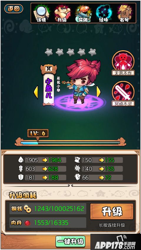 方法:点击侠客-进入界面-点击要升级侠客,下拉功能框,选中升级进入界面,点击升级按钮,即可升级。