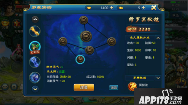 进入注灵界面可以对当前神器阵法进行注灵,需要消耗灵气值。阵法注灵后能够提升相应的属性。注灵到最后一个后,还能进行阵法突破,开启一个新的阵法。