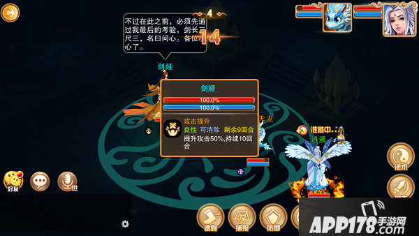 第三回合剑娅会使用魔化真身技能,非常强的辅助技能,除了回复血量外还附带提升50%攻击的效果,持续10个回合。