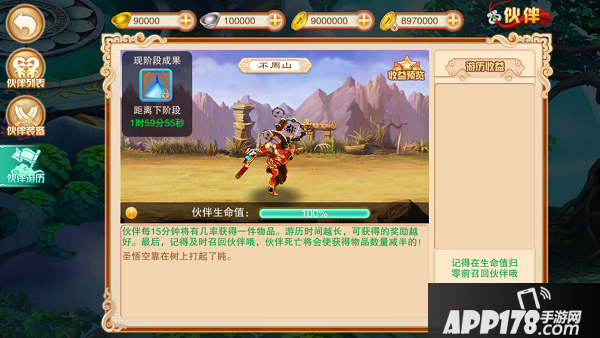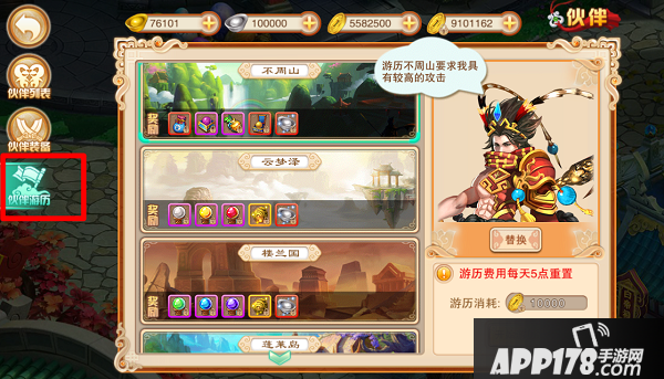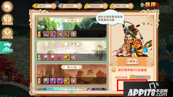 每个游历目的地有各自的属性需求:不周山(需要伙伴具有较高的攻击)、云梦泽(需要伙伴具有较高的闪避)、楼兰国(需要伙伴具有较高的防御)、蓬莱岛(需要伙伴具有较高的法力值)。选定游历目标地点后,可以根据游历目标的属性需求来选择进行游历的伙伴,点击伙伴下方的替换就能进行更换伙伴。