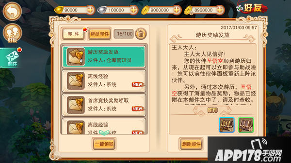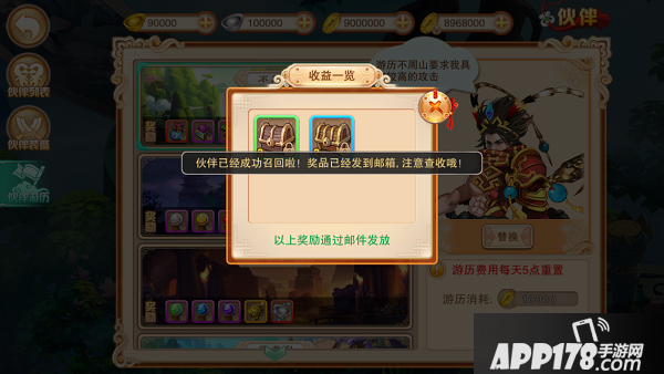 召唤伙伴后就能够获得伙伴游历所拿到的奖励,召回后奖励会通过邮件发放,各位小侠客记得查看邮件哦!
