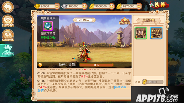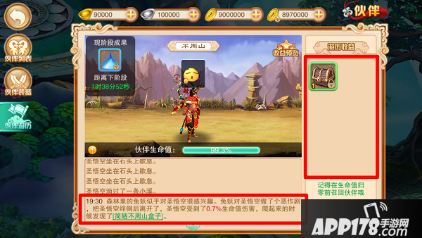 开始游历后,每隔15分钟会触发一次游历事件,并且在触发游历事件时,将会扣除伙伴一定比例的生命值,并有几率获得物品奖励。