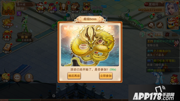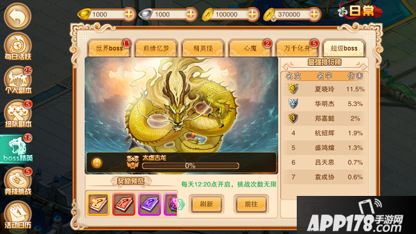 玩家到达40级即可参与讨伐超级BOSS——太虚古龙,每天的12:20超级BOSS活动开始,活动开始后所有符合条件的在线玩家都将收到弹窗提醒。点击立即参与就会自动传送到太虚古龙所在场地。