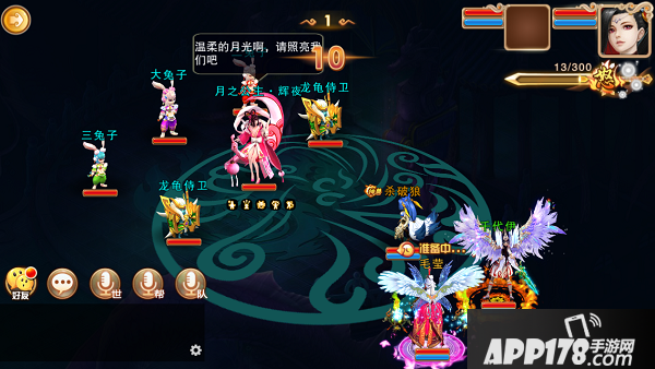 进入战斗后我们能看到前排有辉夜和两个龙龟侍卫,后排有大兔子、二兔子和三兔子。
