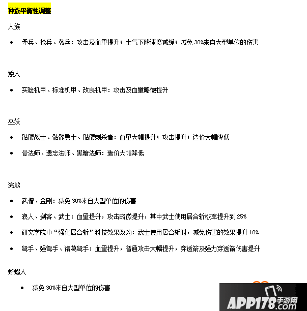 在本次的更新中,种族平衡性调整可谓是玩家关注的重点,因为这是涉及到兵种战斗力的方面,人族、矮人、巫妖、浣熊和蜥蜴人都进行了属性调整,APP178手游小编确切的说,这次的调整只是涉及到兵种上的属性和能力,据了解,很多玩家对人族削弱后都一直大肆吐槽,目前矮人族成为了一家独大的种族,不知道官方下次的版本更新是否会进行调整呢?