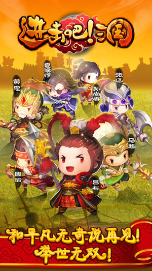 《进击吧!三国》采用韩式Q版风格,集合了最潮的韩式画风,融入最IN的中国元素,以粉拳乱舞的武将为战斗核心,结合收集、养成等乐趣多多的特色玩法,更有将领与兵种的搭配上的无穷战略,让你欲罢不能!