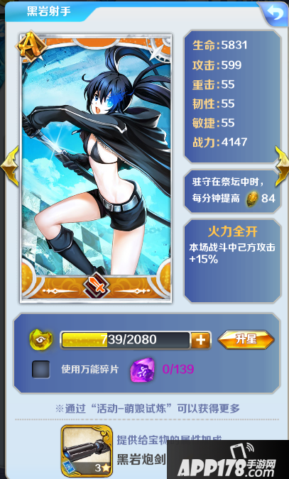 这个时候萌娘卡牌的优势就发挥出来了,一张A级的黑岩射手,升级到金色后,大约可提升宝物700%多的战力,这个时候一个仅有100攻击力的宝物,经过星能、纹章、祭坛、萌娘卡牌这一系列升级后,其战斗力可达到惊人的180000左右。再加上力量源泉固有的10%攻击加成,宝物战斗力妥妥的在200000+。