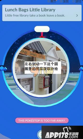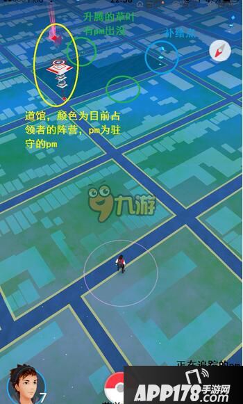 5、大地图上蓝色方块为补给点,很醒目很高的的那种是道馆,不容易发现的会有草升起来的地方表示有pokemon出没。目前大地图上只有这三种标识。到达补给点的时候需要在大地图上点击该补给点,并转动(左右划)中间那个圆盘获取补给。