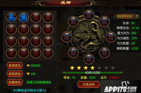 在《降龙诀》中,人物达到70级后才开启战神系统,其面板在玩家角色界面上。开启和提升战神系统需要消耗能量,能量值只能通过人物的等级经验来转化,小心退级哦。