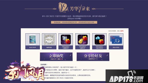 首测期间,每位玩家都可以收到丰厚的登陆礼品,登陆京门风月官网参与抽奖,还有机会领取Ipad,没有领到首测激活码的小伙伴,来官网试试运气吧。