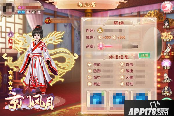 和游戏中的好友结为亲家,两家的关系将更加亲近。当然,只有少年阶段的孩子才能被定亲,指腹为婚什么的还是太早啦,毕竟关系到未来的感情发展。有了联姻的关系后,当然得来点儿实际的实力提升,属性加成效果跟皇子们的属相、品质以及亲密度有关,比如鼠、虎、蛇、猴属相在一起会增加一定攻击,牛、马、羊、猪属相会增加一定防御,兔、鸡、龙、狗属相会增加一定敏捷。想不到现实生活中的姻缘看家庭背景、看生辰八字,在京门风月中也要看属相,传统元素绝不能少。