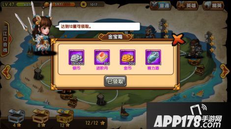 副本——副本是前期获得元宝的主要来源之一,因为前期的副本好打,每个章节达到4.8.12颗星星都可以开启宝箱,宝箱里面就有大量的金币。