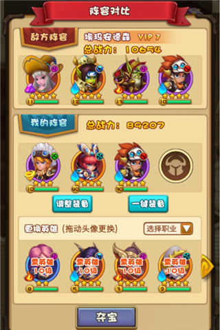在荒岛上有各种被遗弃的宝物,而勇士们在寻找这些神秘的所在时会遭到别的玩家阻挠。他们分列在宝藏附近守卫着,只有一一打败他们才能获得宝藏!在选择好对手以后,能够看到对方的总战力,以及英雄等级、职业、星级和元素属性等数据。因此根据对方阵容,可以在选择英雄时按照职业相克(剑士克制圣骑、刺客;猎人克制法师、剑士;法师克制圣骑、剑士等)及元素相克(风→地→水→火→风)的规则搭配阵容,能够对对方起到更好的克制效果哦!