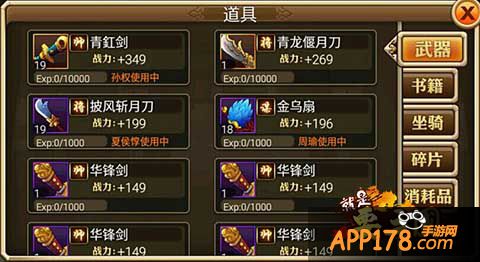 青龙偃月刀、青钢剑、方天画戟、赤兔马……《就是要三国》中的装备分为武器、坐骑、书籍三种。在游戏中,三国时代赫赫有名的所有装备都将全部呈现,并且根据品质不同,装备划分为橙、紫、绿三种。相对于单一附加血量的坐骑,游戏中的所有武器都根据