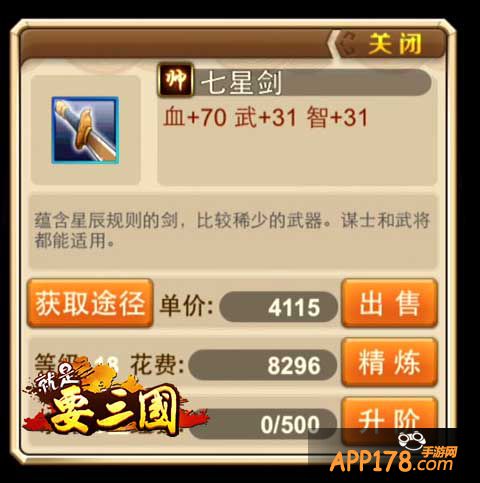 神器可不是天生而成,在《就是要三国》中,玩家需要对武器与书籍进行升级、升阶来使其更加强悍。升级可以直接提升装备属性,其最高等级不超过玩家等级,但出现暴击的话就不一定了。升阶则是吞噬次一阶的装备来提升星级,即橙色吞噬紫色升星,紫色吞噬蓝色升星……星级越高,其属性上限也就越高。满星的橙色装备是所有玩家的终极梦想!