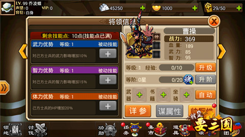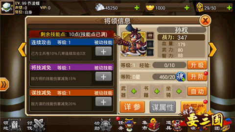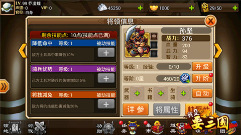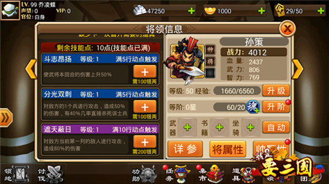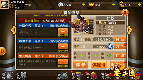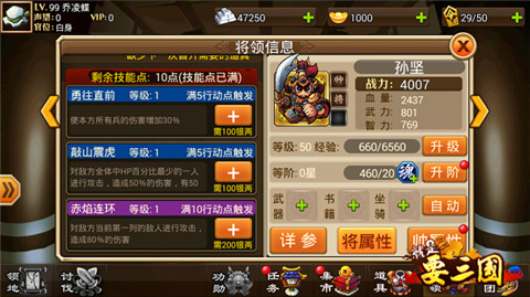 帅孙权可以说开了全团减伤链,肉盾帅到50级之后变身成为谋之后会有何强大的技能呢?一眼看去大家会觉得,擦了黑油,这么鸡肋的技能!如果你这么看的话那你就打错特错了!“麻痹大意”这个技能下降对方全军智力50%,这意味这什么呢?意味对面的魔抗下降50%!你所有武将的技能将会多打50%的伤害!没准就是这50%的伤害能秒杀对面武将!