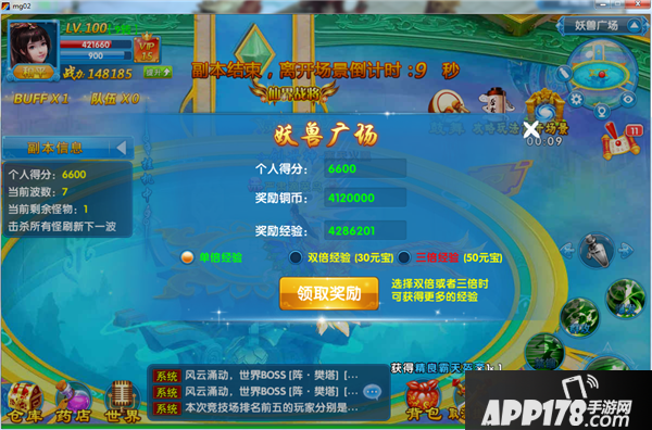 BOOS死亡活动结束,结束时会弹出结算界面,积分越高奖励越好,玩家也可以花费一定的元宝获得2倍、3倍的奖励。