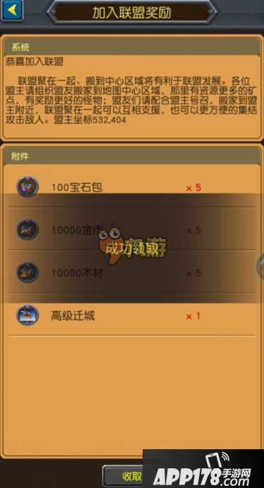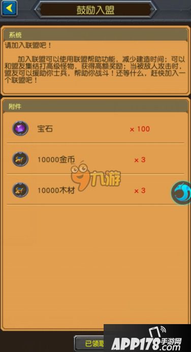 巨龙之战游戏前期会以邮件的方式提醒玩家加入联盟,鼓励入盟邮件中含有100宝石。玩家加入联盟后也会有加入联盟奖励,总共有500宝石,会以宝石包的形式通过邮件发放到玩家包裹里。