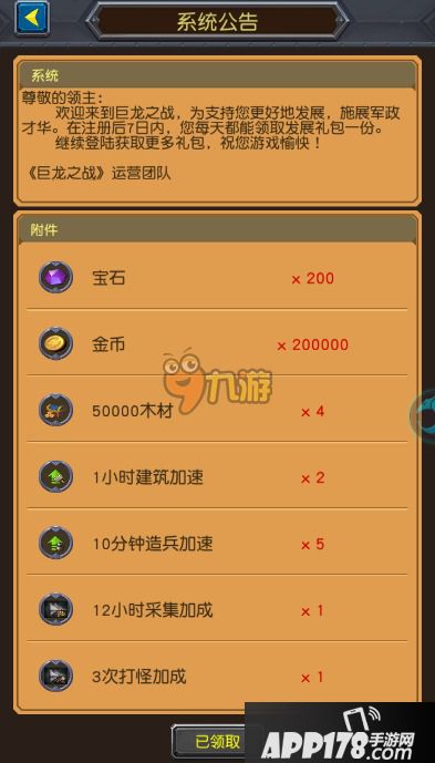 巨龙之战新服的玩家在注册后7日内,每天都能领取发展礼包一份。礼包内容包括金币、木材、各种加速道具、采集打怪加成道具等,最为重要的是礼包每天都包含200宝石。有了每天200宝石的发展礼包,相信不少玩家都能在前期得到良好的发展。