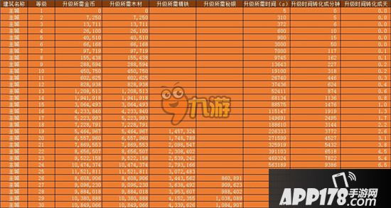 主城升级所需资源和时间: