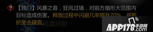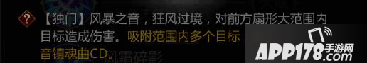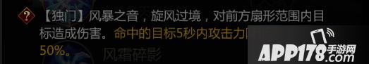 【独门】风暴之音,旋风过境,对前方扇形范围内目标造成伤害。命中的目标5秒内攻击力降低20%,减速50%。攻击1次,伤害400%。
