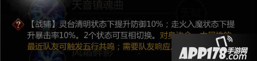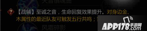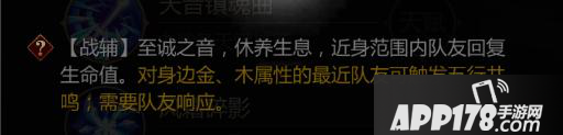 【战辅】至诚之音,修生养息,回复自身生命值。对身边金木属性的最近队友触发五行共鸣;需要队友响应。瞬间回复生命值15%。