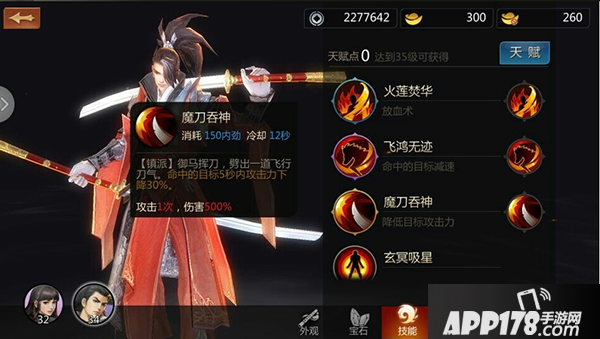 第三个技能【魔刀吞神】:魔刀是天忍大招【镇派】御马挥刀,劈出一道飞行刀气。命中的目标5秒内攻击力下降30%。攻击1次,伤害500%!