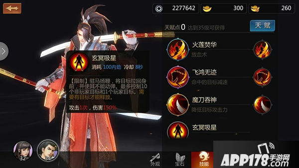第四个技能【玄冥吸星】:天忍唯一一个控制技能【限制】驻马扬鞭,将目标拉回身前,并限制其不能动弹。最多控制10个非玩家目标和一个玩家目标。需要有目标才能释放。攻击1次,伤害150%!