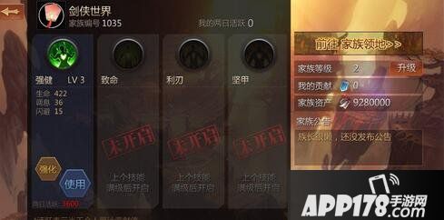 同时,家族族长也可以强化家族技能!每次每条属性都强化一次后,技能整体的等级才会增加,当一个技能满级后机会开启下一个技能,每个家族的技能都是4种,分为:强健、致命、利刃、坚甲;每个技能满级为10级!根据需要“使用”的技能不同,所需兑换的两日活跃数也不同,活跃表示大侠这两日的贡献值!