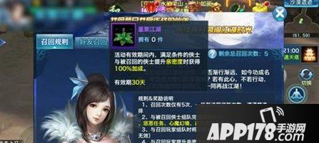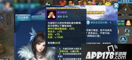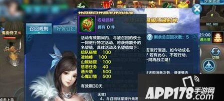 在1月12日至1月31日期间,每名少侠均拥有5次召回次数,少侠可以通过QQ或微信找到昔日好友,发出召回邀请。若少侠成功召回往日好友,则与其组队时就可以享受有效期为30天的多重特殊福利。少侠与被召回侠士组队参加组队秘境、凌绝峰等日常任务,可以获得额外的名望值,同时还将获得攻击力、全抗、生命、经验等增益加成。少侠在与被召回少侠提升亲密度时,还将得到有效期为30天的100%加成。
